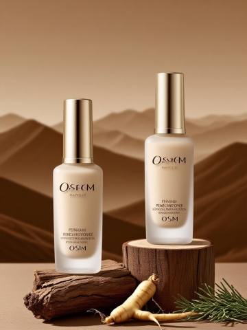 画面中有两个产品,前后放置,保持主体外观和形状。主体放置一根木块上,搭配人参、干枯树枝、何首乌、艾草。以暖棕色调远山为背景,营造古朴自然且高级的质感。