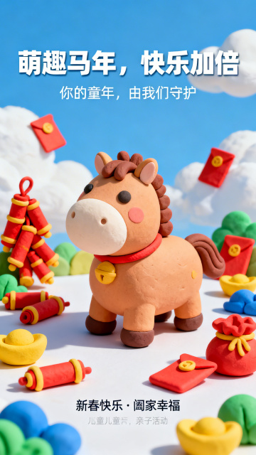 软3D粘土风格,萌趣马年主角搭配红包、鞭炮等元素,充满喜庆与童趣,传递新春欢乐氛围。