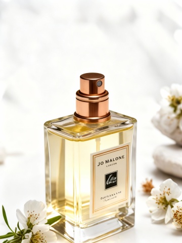 玻璃风香水瓶置于粉色托盘,搭配金属盖与柔美花卉,红丝带点缀,呈现优雅浪漫的节日氛围。