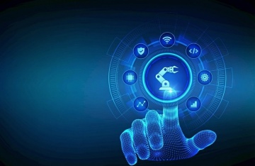 未来感科技实验室,3D风机器人操作虚拟现实,简约主义设计,展现高科技氛围。