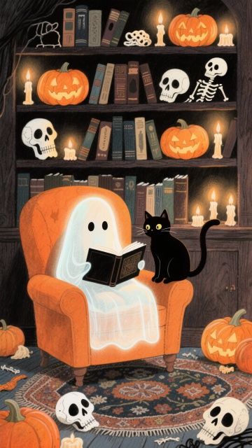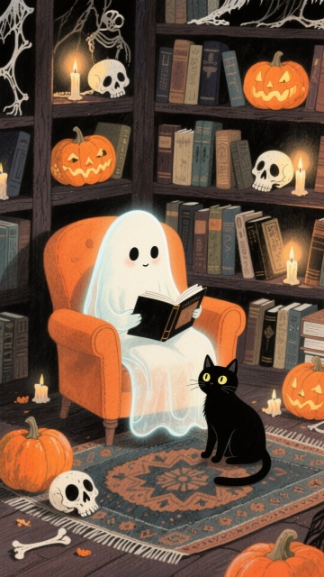 插画风与拟人风结合,卡通感十足的幽灵在温馨书屋中阅读,黑猫相伴,南瓜灯与骷髅点缀,营造出故事感十足的万圣节氛围。