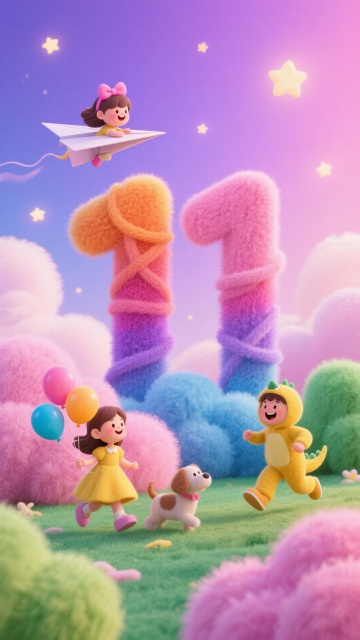 梦幻柔粉背景,毛绒质感的“11”数字与云朵交织,软3D卡通风格,萌趣人物与纸飞机共舞,甜蜜可爱,节日氛围满满。