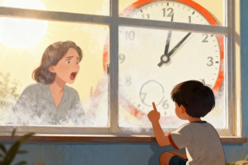 温馨的家庭场景,一位母亲蹲下身,微笑着倾听孩子说话,孩子眼睛亮晶晶地比划着,周围有象征想象力的彩色气泡和星星元素,画面充满温暖的光感,整体氛围柔和治愈