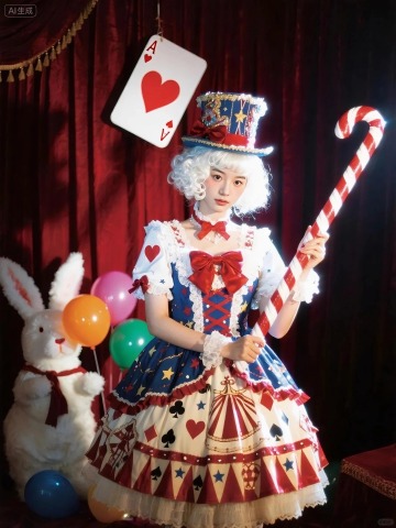 穿着华丽马戏团风格洛丽塔服饰,以红、蓝、米白为主色调,布满马戏团图案、星星、扑克牌元素,搭配多层裙摆和大蝴蝶结;头戴装饰繁复的高顶帽,白色卷曲假发;双手拿着一个红白条纹的巨大糖果手杖,身旁有巨型白兔玩偶、彩色气球,背景是红色幕布,悬挂巨型扑克牌、彩色串灯