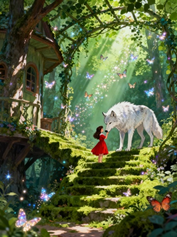 森林场景插画,巨大的蘑菇房子,天空中有一架巨大的飞机掠过,色调温馨,以绿色为主。画面中间站着一位少女,她身旁有一条狗,视角是从女孩背后望向飞机,采用鱼眼镜头效果,呈现出独特的空间扭曲感和广阔视野