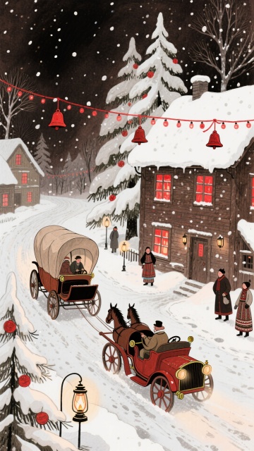 复古感插画风,厚涂手法营造温馨雪夜,拟人化人物与马车穿梭于红灯高挂的小镇,水彩质感融入油画光影,传递喜庆节日故事感。