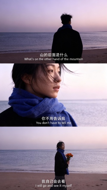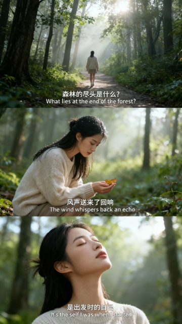 帮我生成图片,一组三宫格日系森系艺术感写真图,场景为清晨有薄雾的森林。图中人物和参考图一致,人物和脸不变,衣服为米色或白色的毛衣。 第一张为远景,人物渺小的背影走在林间小径上,阳光穿过树叶形成光斑,添加中英字幕“森林的尽头是什么? What lies at the end of the forest?”; 第二张为中景,人物侧身蹲下,手中捧着一片落叶,低头凝视,发丝上有晨露,添加中英字幕“风声送来了回响 The wind whispers back an echo”; 第三张为脸部特写,人物微微抬头,闭着眼睛感受阳光,表情平静而治愈,光线柔和地打在脸上,添加中英字幕“是出发时的自己 It's the self I was when I started”。 整体色调清新、偏绿,带有空气感。采用柯达胶片效果,色彩柔和,饱和度较低,画面明亮通透。光线为穿过树林的柔和散射光,营造安静、治愈的氛围。三张图合成一个三宫格,字幕位于底部居中。
