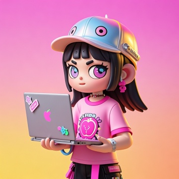 软3D风卡通少女,霓虹灯色系搭配科技感笔记本,梦幻潮流造型,虚拟现实风格,充满可爱与未来感。