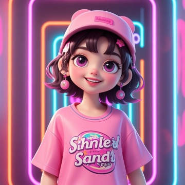 软3D风卡通少女,粉色霓虹背景,萌趣未来感设计,甜酷潮流穿搭,充满可爱与科技融合的视觉魅力。
