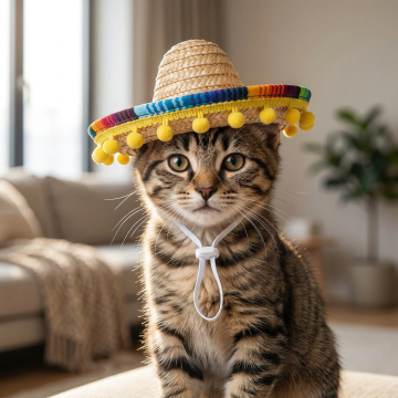 猫咪身着灰姑娘的裙子、头戴皇冠,慵懒窝在印有 “COOZZile” 标识的猫砂盆里面,猫砂盆边有一些糖果,旁置水晶鞋、南瓜灯、巫师帽等道具,深蓝碎花墙面背景,蓝白配色的格纹地毯