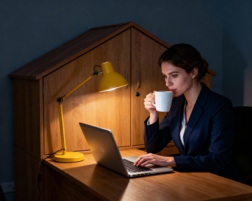 现代简约风格办公室场景,一位欧美女性坐在灰色转椅上,身着白色衬衫,正在白色办公桌上专注工作。桌面上放置白色咖啡加热杯垫,杯垫上有一杯拉花拿铁咖啡和一部正在无线充电的智能手机,手机屏幕显示充电图标。背景为虚化的绿色植物,光线明亮柔和,整体画面简洁干净,突出咖啡加热杯垫的产品功能。