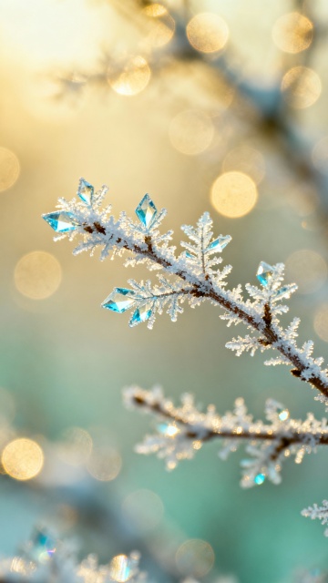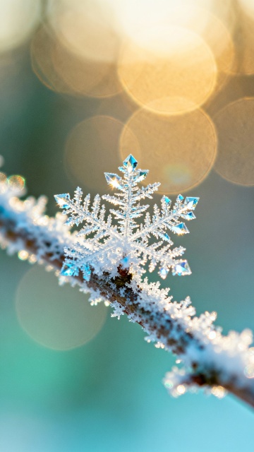 一幅极致细腻的冬季微距摄影画面,背景是柔和朦胧的浅蓝色天空,点缀着梦幻般的散景光斑与飘落的细小雪花;前景中,一根覆盖着晶莹霜花的枯枝从右上角斜向伸展,枝条纹理清晰可见,霜花如羽毛般蓬松洁白;画面中央偏下位置,一颗结构完美、棱角分明的巨大六角形雪花悬浮于空中,其冰晶细节纤毫毕现,透出清冷的光泽;下方是虚化的雪堆,表面布满细碎冰晶与柔和反光,营造出宁静、纯净、空灵且略带神秘感的冬日氛围;整体采用高对比度的冷色调,以白色、冰蓝和淡灰为主,光影柔和而富有层次,突出冰雪的透明质感与寒冷触感,构图遵循三分法,视觉焦点集中在中央雪花,留白充足,画面干净通透,充满诗意与静谧之美。