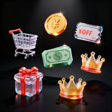 一套6张系列素材集合,每张均为规整排布的单一元素造型图案,保持简约现代风格,采用纯色背景。第一张:半透明渐变红色礼盒,顶部系着金色蝴蝶结,礼盒呈现轻微立体感,边缘有柔和高光和阴影,整体通透光滑;第二张:半透明渐变优惠券,带有虚线剪切边和折扣标识,保持与礼盒一致的光影质感和简约设计;第三张:半透明渐变喇叭造型,喇叭口朝右,线条流畅,体现现代简约风格;第四张:半透明渐变鼓掌手势,双手掌心相对呈鼓掌状,手指圆润,保持整体通透感;第五张:半透明渐变一堆金币,金币堆叠呈金字塔状,表面有光泽,体现金属质感;第六张:半透明渐变购物车,车筐为网格状,带有把手和轮子,造型简约现代,所有元素均保持统一的半透明渐变效果、光影处理和简约设计语言。