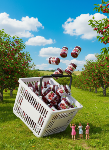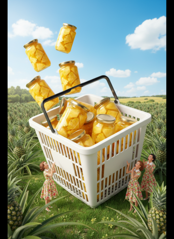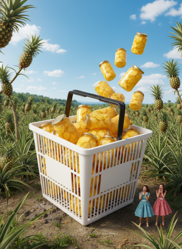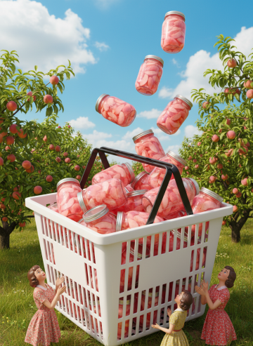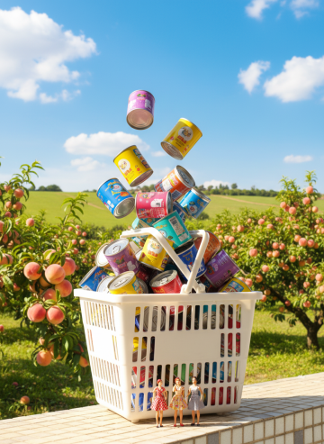 画面的主体是一个向镜头倾斜的白色塑料购物篮,将画面中的罐头提取到白色塑料购物篮里撑满画面,主体重复的、拥挤的、密集且杂乱堆叠,堆满内部,有的图片中的主体向镜头飞过来,高饱和色调。背景是一个蓝天白云的田园场景:周围都是桃子树。三位穿着复古裙装的小人看着购物篮。