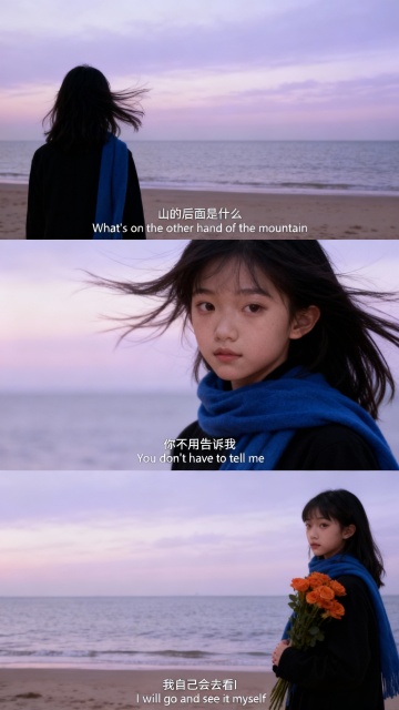 特写:少女低头,雪花落在发梢,眼神温柔,字幕 “我自己会发现暖”“I will find warmth myself”;