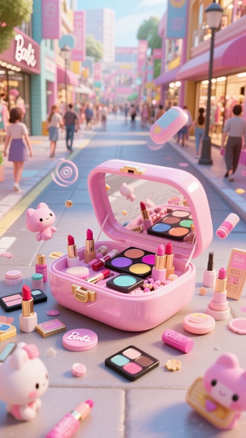 街道上巨大芭比风化妆盒,里面和周围装满并环绕各类可爱商品(美容美妆品),周围有漂浮的商品与小装饰元素,背景是商场购物街