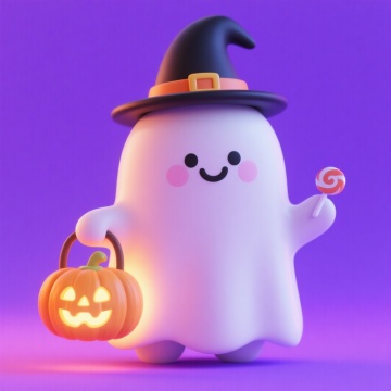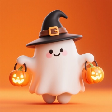 软3D风格的可爱小幽灵,拟人化设计搭配巫师帽与南瓜灯,卡通感十足,节日氛围浓厚。