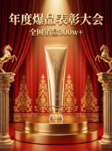 护肤品的电商场景,产品竖立在中间,背景有花环环绕,粉色调
