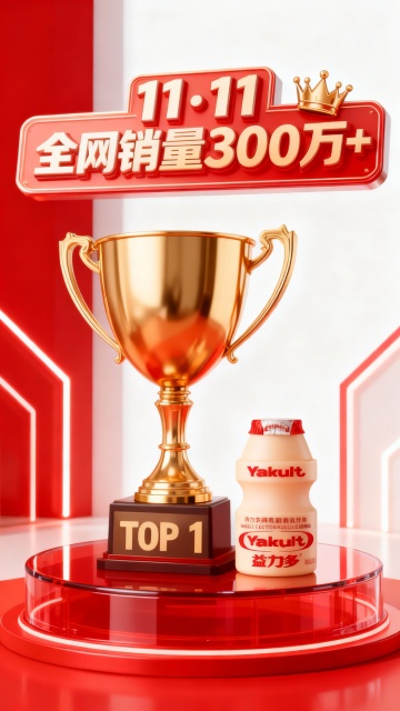 画面中心是一个底座印着“TOP 1”的大型金色奖杯,奖杯位于红色圆形透明展台上,商品位于奖杯一侧,画面上方是大型长方形立体文字牌“11·11 全网销量300万+”,皇冠元素装饰文字牌,红白渐变背景,几何灯管装饰,美妆轻奢氛围。