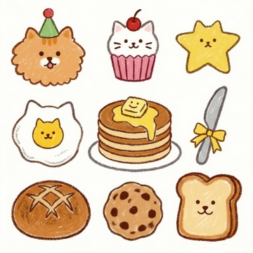 简笔画风格,六只不同造型的小猫,每只小猫都有圆润的头部、三角形的耳朵、黑豆般的眼睛和小巧的鼻子,线条简洁流畅,轮廓清晰,造型可爱。第一只小猫举着一颗爱心,周围有几颗小星星;第二只小猫抱着一条小鱼干,嘴角微微上扬;第三只小猫戴着蝴蝶结,爪子向前伸出,仿佛在打招呼;第四只小猫坐在地上,尾巴卷曲在身侧,眼睛眯成一条缝,显得十分惬意;第五只小猫手里拿着一根棒棒糖,头上有一个小气泡;第六只小猫戴着一顶小帽子,双手背在身后,姿态俏皮。每只小猫周围都点缀着一些简单的装饰元素,如小星星、小弧线等,整体画面充满童趣,构图分布均匀。