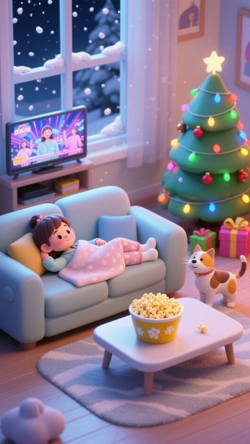 窗外飘着雪花,室内小女孩慵懒的躺在沙发上 电视机播放着综艺节目,茶几上大桶爆米花,乖巧的小猫猫,氛围暖暖惬意