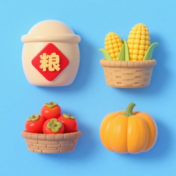 软3D风+粘土感,卡通化秋收元素,重拟物细节,清新蓝底衬托丰收喜庆,充满可爱与节日氛围。