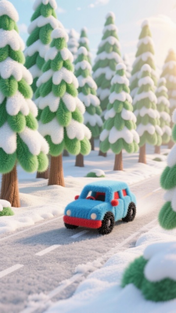 毛绒质感的3D卡通雪景,萌趣小车穿行于梦幻雪松间,温暖色调营造冬日温馨氛围,充满童趣与节日气息。