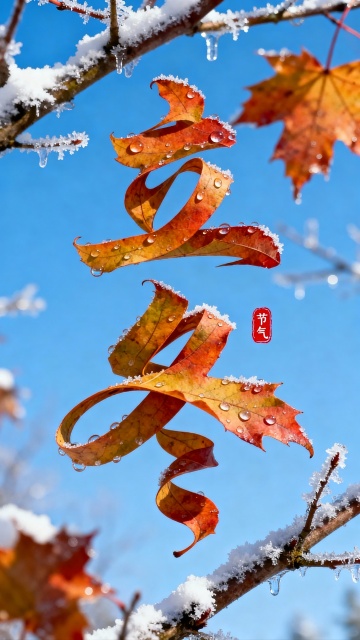 中式感实景,秋叶拟字立冬,水珠晶莹,雪覆枝头,光影交错,唯美元素,文艺氛围浓厚。