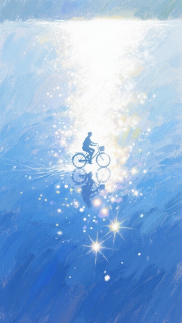 宫崎骏绘画风格,在一片强烈反射阳光的水域。深蓝色的水,中景处可以看到一个骑自行车的人影,人影与明亮的光线形成对比,显得格外渺小,营造出一种梦幻般的意境。胶片质感,弥散颗粒。