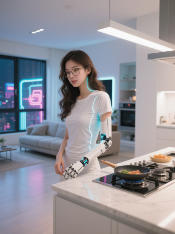 赛博朋克风机械女性,融合未来感与科技感,金属机身搭配霓虹灯背景,3D重拟物设计展现机能美学。