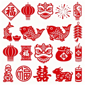 文创产品设计,10款不同形象的春节主题香包,配色为中国红和金色,白色背景。香包造型包括:1. 舞狮头形象,红色主体配金色鬃毛与流苏;2. 元宝形状,立体饱满,表面有金色祥云纹路;3. 生肖兔(或当年生肖),圆头圆脑,耳朵耷拉,手持金色福字;4. 灯笼造型,顶部有金色提手,表面绘红色缠枝莲纹;5. 鲤鱼跃龙门,流线型身体,鱼鳞用金色渐变表现;6. 福袋样式,束口处系金色绳结,正面绣金色“福”字;7. 中国结造型,多角对称,边缘有金色包边;8. 财神帽形象,帽檐镶金边,顶部有金色绒球;9. 鞭炮串,多个小鞭炮串联,红色主体配金色引线;10. 梅花绽放,五瓣花朵,花蕊用金色点缀。所有香包均有细腻刺绣纹理,部分带有金色流苏或挂饰,整体风格喜庆传统,细节精致。