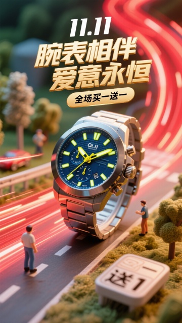 白色的“11.11”logo,巨大亮金色质感的主标题“腕表相伴 爱意永恒”使用 bold 的无衬线粗体,以突破式的布局斜贯画面,充满力量感。副标题“全场买一送一”则以块状标签形式固定在角落,醒目直接。