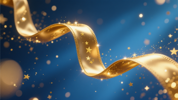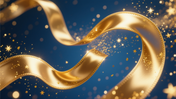 蓝色背景,金色的丝绸飘带在画面中优雅地流动,带有闪亮的金色光点和粒子效果,整体呈现出华丽、大气的氛围,光线明亮,质感细腻,金色飘带具有丝绸的光泽和褶皱感