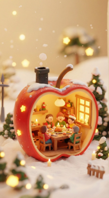 3D粘土风微缩艺术,苹果屋内温馨圣诞晚餐,卡通人物围坐烛光,暖黄灯光与雪景交织,营造可爱节日氛围。