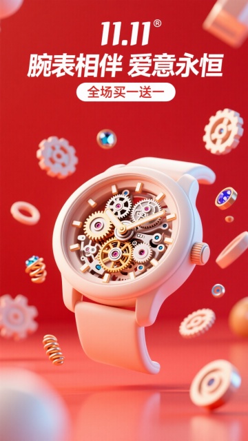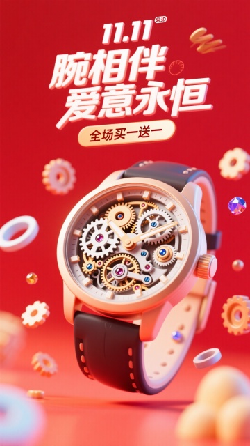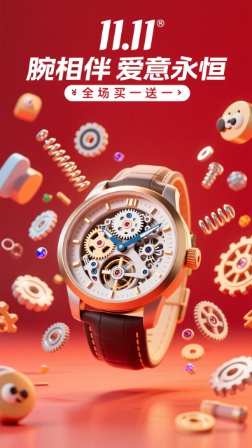 软3D风机械腕表,金属质感齿轮环绕,红底映衬喜庆浪漫,11.11促销主题,温馨科技感十足。