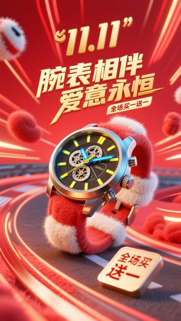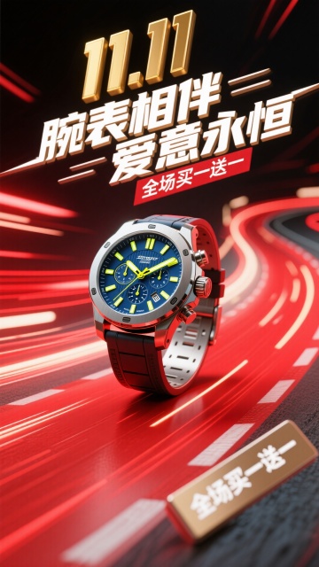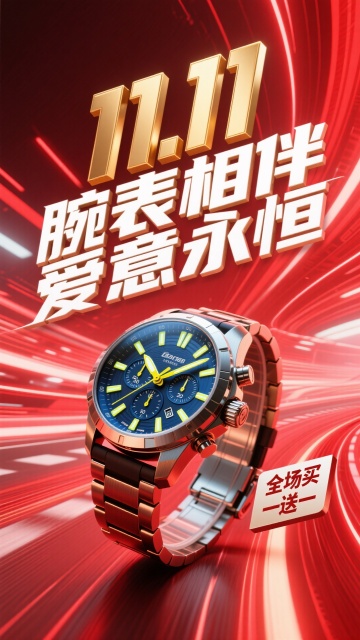 背景是充满动感的亮红色速度线抽象光影,如同赛道上飞驰的轨迹。一款硬朗的机械运动手表以微微倾斜的角度置于画面中心,表盘细节清晰,指针散发着幽蓝或亮黄色的夜光,与红色背景形成强烈撞色。表身周围有金属质感的光效流动,强调速度与力量。 白色的“11.11”logo,巨大亮金色质感的主标题“腕表相伴 爱意永恒”使用 bold 的无衬线粗体,以突破式的布局斜贯画面,充满力量感。副标题“全场买一送一”则以块状标签形式固定在角落,醒目直接。