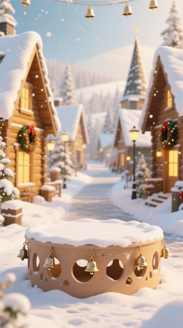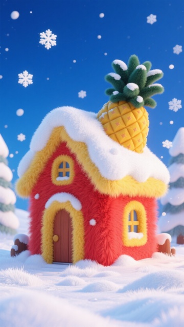 软3D风卡通雪屋,暖光透窗,彩条围巾点缀,鹿与雪橇营造温馨梦幻圣诞氛围。