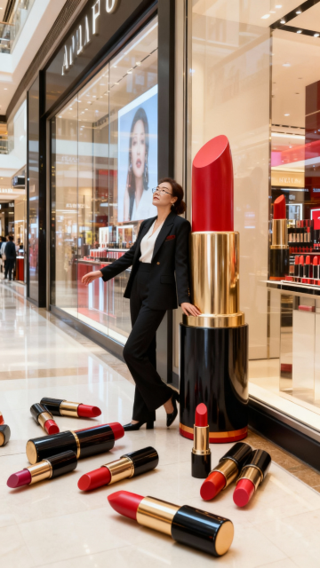 现代感与时尚感交织,拟人风设计将巨型指甲油瓶融入人物姿态,金属电梯空间强化体积感与玻璃风质感,潮流美学跃然眼前。
