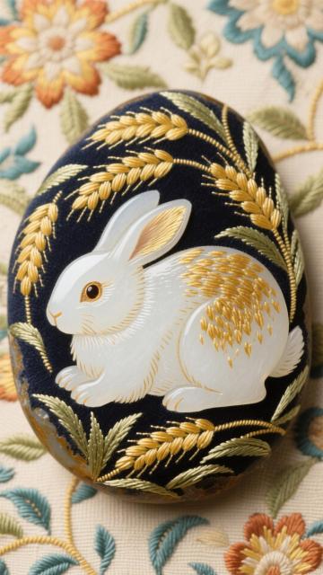 复古刺绣风复活节蛋,融合工笔细腻与欧洲宫廷艺术,白兔与麦穗交织,呈现古典优雅的唯美意境。
