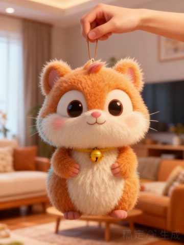 软3D风格的萌趣鼯鼠挂件,毛发生长细腻逼真,卡通造型可爱温馨,搭配金色小铃铛,营造节日氛围。
