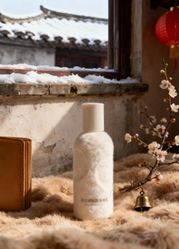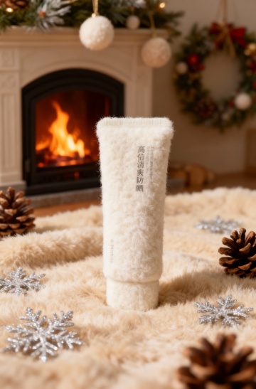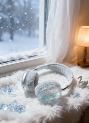 商品变身毛绒质感。摆放在浅灰毛绒毯上,点缀白色毛绒球与银质书签,背景是原木书桌、积雪树木、翻开的绘本,柔和自然光让毛绒质感更细腻。