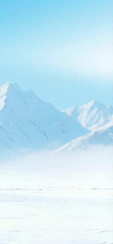 超写实风格的冬季雪景特写,纯净的白色积雪覆盖大地,呈现出细腻的纹理和自然的波浪起伏,远处是朦胧的雪山轮廓,天空为明亮的浅蓝色并带有柔和的光线效果,画面中飘着轻盈的雪花,近处的雪地上点缀着被雪覆盖的城市建筑屋顶和尖顶轮廓,整体营造出宁静而梦幻的冬日城市氛围,光线柔和,色彩以蓝白为主色调,保持高度的真实感和细腻的质感表现。
