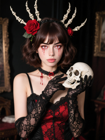 哥特风少女手持骷髅,红黑双色蕾丝裙搭配骨冠与血泪妆,复古油画质感,皮影式光影营造神秘惊悚氛围,万圣节主题视觉。