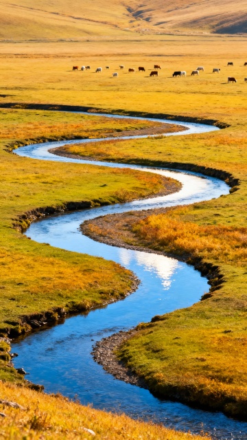 秋日,草黄色牧场,一条S型清澈河流蜿蜒其中,远景有微小的牛羊在吃草,宁静广阔,9:16竖图,摄影级质量。