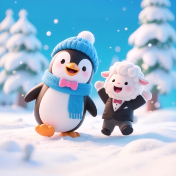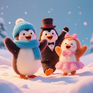 毛线编织的软3D企鹅,戴黄围巾捧雪球,拟物质感与可爱卡通结合,营造温馨趣味冬日氛围。
