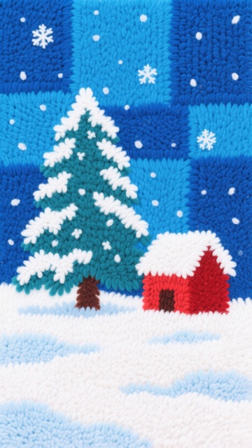 刺绣风插画,蓝调雪景温馨治愈,轻拟物树木与小屋,面料质感细腻,雪花飘落,冬日清新感十足。
