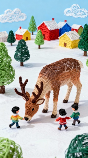 毛发生长风与软3D结合,萌趣鹿形玩偶穿梭雪境,手持晶石,绿围巾飘逸,梦幻温馨的圣诞氛围。