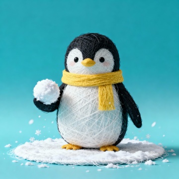 毛线编织的软3D企鹅,戴黄围巾捧雪球,拟物质感与可爱卡通结合,营造温馨趣味冬日氛围。