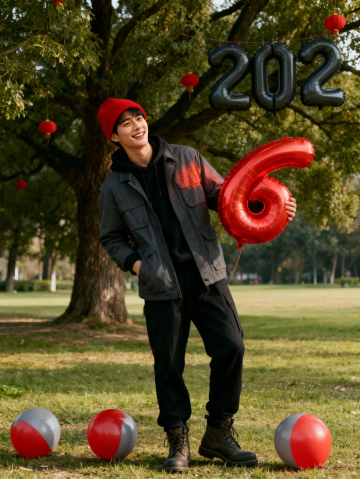国潮风实景拍摄,红黑双色充气数字“2026”呼应节日喜庆,结合传统灯笼与现代服饰,营造年轻活力的年味氛围。