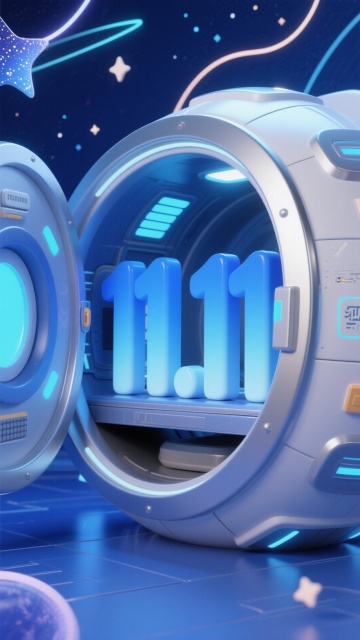 未来感十足的3D太空舱内,霓虹蓝光映衬“11.11”数字,金属质感与虚拟现实元素交织,梦幻酷炫,科技感爆棚,呼应双十一大促主题。